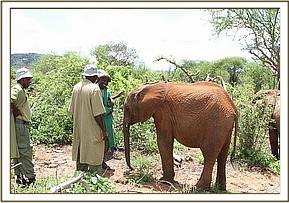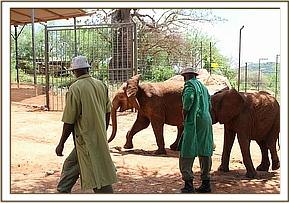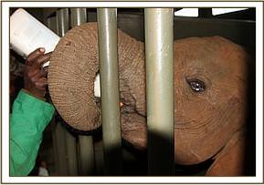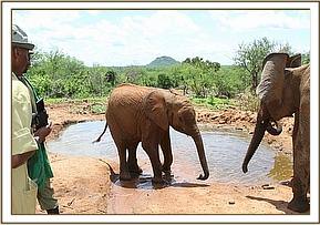 All three orphans slowly wandered out of their travelling rooms, getting their balance and stretching their legs before spotting their bottles of milk and racing to get their first gulp. The Ithumba milk-dependent orphans had not yet returned to the stockades to greet the new arrivals, so the three Nairobi orphans had plenty of time to finish their milk in peace and be led to the water trough to cool themselves down.