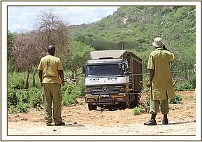 Without delaying the orphans journey, the film crew documented their final leg to the Ithumba stockades, passing smoothly along the roads that can at times lay deep under mud and water with just one heavy rainstorm. The film crew having raced to the stockades first to film the trucks entrance was set-up and ready as it maneuvered into the compound. The Nairobi keepers were first to jump out of the truck and greet their long lost keeper friends before the compartment doors were slowly opened, first revealing Turkwel, then Kainuk, then Sities.