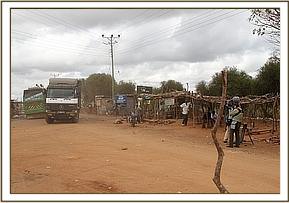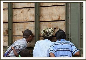 As usual the truck stopped part way to Ithumba at around 7am so that the keepers could give the elephants some milk and cut some greens from the side of the road. Stopping for just ten minutes, all three elephants were coping extremely well with the journey and enjoyed the greens thoroughly, Sities trying to steal as many branches from Kainuk's compartment as she could, standing up on the bars and reaching her trunk over the gate to snatch whatever she could manage. Stopping along this busy main road always attracts many inquisitive locals, who watch the keepers closely and soon approach the truck to peer through the small ventilation slats on the side of the truck, astonished and somewhat perplexed at what they see inside.