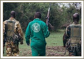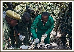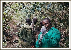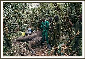 With his tranquilizer gun prepared, the rest of the team entered the forest and for the next hour, carefully negotiated their way through the thick bush. On first sighting the elephant, a mock charge ensued, which caused quite the commotion in this confined space, before the elephant vanished into the thicket once more. Dr. Njoroge was however unperturbed in his desire to treat the animal and with two Rangers he set off again in pursuit, the rest of the team hanging back so as not to get in the way or risk spooking the elephant.