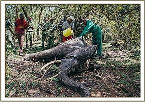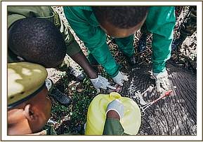 It was immediately apparent to Dr. Njoroge that the injury to the elephant’s right upper flank had been caused by a bullet, given the angle of entry and he set about treating the wound. Retrieving the bullet was not possible, however the important point was, it had not hit or shattered any bones. The wound was extensively treated before the Vet proceeded to inject the elephant with anti-inflammatory drugs and anti-biotics to aid healing and keep away any possible infection. Finally, healing natural green clay was applied to the wound and the team left the area to allow the Vet to give the quick acting reversal drug for the anaesthesia.