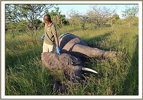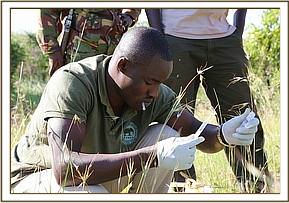Fred Oring’a, a KWS Vet working with Sky Vet on this case, promptly prepared two darts, and one for the Mum who had a spear wound injury to her back and one for her stricken baby.