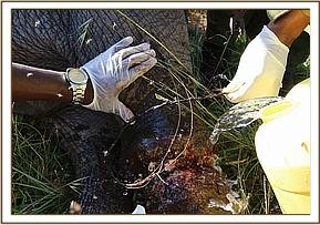 Treatment of the calf was carefully done and a cable snare cut away having penetrated deep into the flesh of the left hind leg, almost reaching the bone. It is hard to imagine the unspeakable agony this must have inflicted and snares made from cable in this case, but wire or nylon are undoubtedly the crudest and cruellest form of poaching, causing a slow agonising death, indiscriminately ensnaring their prey, as when this snare was laid by poachers it was not intended for a baby elephant. Once the snare was removed the wound was cleaned and treated before the team rushed to attend to the spear injury to the mother’s back which thankfully, while deep, did not appear too bad. They were both revived just as daylight faded and were able to regroup back with their herd before night fell as the herd waited patiently close by. It was as if they knew help had come.