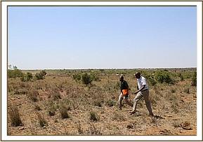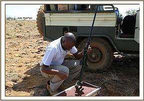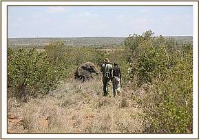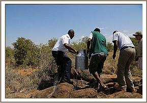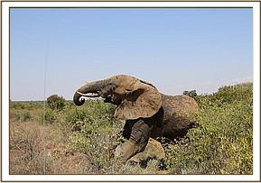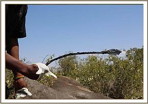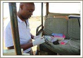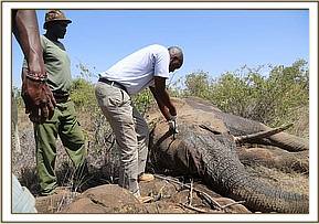 During this time the elephant stood up again briefly before falling fortunately on the correct side enabling easy access to the metal spear shaft. Dr. Bernard Rono began pulling at the spear which was firmly lodged in the bull’s head, and everyone present was horrified to see how deep it had penertated. Once the spear was removed there was some haemorraging from his trunk, but not as much as expected. His wound was treated and long acting antibiotics were administered. When the vet was satisfied with the completion of the treatment a revival antidote was administered and the team watched on proudly as he rose to his feet. He appeared absolutely fine and slowly ambled off into the undergrowth. A coloured cross had been sprayed on his back so that his movements can be monitored in the coming days.