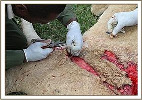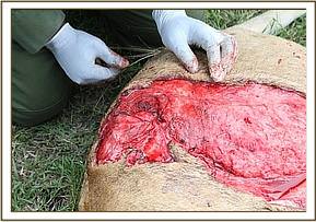 The wound was extensive and involved the soft tissues and the skin. The vet cleaned the wound using normal saline and then sutured it closed.