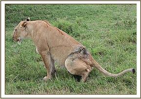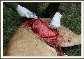 This lioness, who is a dominant member of the Marsh pride, was born within the marsh environs and had recently given birth to three cubs. She was found to have a dangerously deep wound but luckily without perforations to the stomach wall or any bone dislocation.