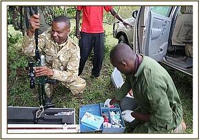 DSWT funded Sky Vets at work in the Mara in an effort to save an injured lactating elephant with a young calf.