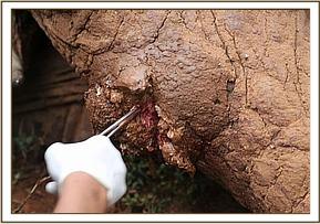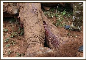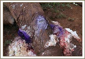 The elephant suffered from two injuries to the front leg, clearly bullet wounds. One bullet had passed through the leg leaving a small entry wound and a large exit wound below the knee, the other had passed the leg on the inside tearing a large amount of flesh and leaving a gaping open wound.