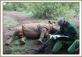Solio came to us at the end of September 2010, orphaned at the age of six months old, and on arrival proved to be a serious hand full. She charged and chased the keepers at any given opportunity, and every one soon got use to having to be swift and fleet of foot around her. Now, 8 months on, the transformation is incredible, for she now loves her Keepers immensely, following them trustingly throughout the day and enjoys nothing more than rolling onto her side and letting them scratch her face and tummy. She loves this so much that whenever a Keeper walks to her she quickly lies down to encourage them to give her another quick cuddle! She truly is a remarkably calm and a very gentle black Rhino who has captured the hearts of all of the Keepers. Most Rhino calves her age tend to play a little rough, not always stopping in time and occasionally bumping the Keepers in the shins. Solio, since taming down, has never done this, and is extremely and a real softy. Every day she goes out with 2 Keepers and spends the day browsing, playing, sleeping, and of course getting lots of pampering from them. After her afternoon milk feed she enjoys having a dust bath, where 2 or sometimes 3 keepers assist with rubbing her down with soil, and playing with her, generally spoiling her rotten.