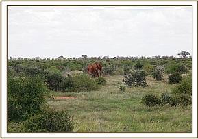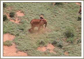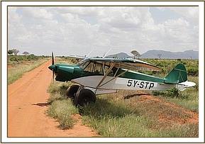 On the return flight the Cub passed over a rare Martial Eagle perched majestically in a tree top and by chance spotted a herd of ten elephants off to the right. The plane was running low on fuel but diverted to check them out. Immediately, it was clear there was a casualty. A young bull was trailing at the back of the herd with a large wound on his right side. The pilot decided to land nearby to save fuel and to call Dr. Poghon, the KWS Vet. He got airborne once more to check on the position of the elephants and then landed to meet up with the Vet Team. The plane was pushed off the road and the Trust's vet vehicle was used to head the short distance off road to the elephant.