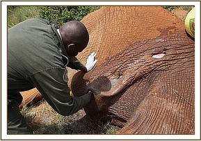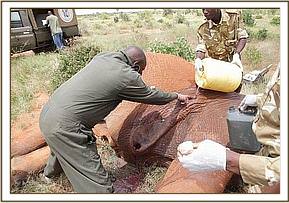 It didn’t take long for the dart to take effect. The bigger bull moved off whilst the patient wobbled for a moment and then stood still. The Vet Team disembarked, pushed him over onto his side and set to work quickly. Three KWS vets began treating the severe wound on his side which was giving off a putrid smell. A huge abscess was cut open discharging a mixture of pus and sand. A large piece of dead muscle was pulled out and an arrow removed from inside the wound.