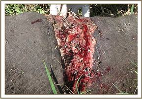 The wound was thoroughly cleaned using 10% Hydrogen Peroxide, Tincture of Iodine and finally sprayed using a tetracycline spray. Long acting antibiotic was also administered intramuscularly to cushion the calf from any opportunistic bacterial infections through the wound.After all the treatments were administered, the calf and its mother were revived from anesthesia almost simultaneously and our greatest joy came after witnessing their re-union by greeting each other with their trunks. The calf could be heard making sounds to the mother maybe confirming that we had not hurt her in any way and only removed the wire snare around her leg which was hurting terribly then.