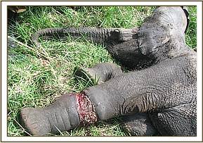 On the morning of Saturday 23rd October 2010, just after conclusion of the Wildebeest collaring in the Amboseli and Nairobi National park dispersal areas, the Mara vet unit received a distress call from Mara Triangle management about an elephant calf that was spotted dragging a wire snare on its front left leg