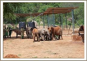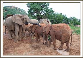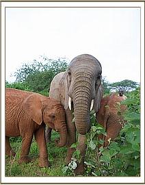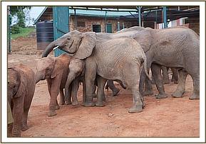 At 6.00 am when the Keepers opened the stockade doors Wendi and the others rushed over amidst great excitement to greet the new babies warmly. Suguta was a little overawed initially, and Wendi sensing this paid special attention to her, tenderly hugging and guiding her. The Nursery babies basked in all this, and for Suguta, who arrived in the Nairobi Nursery so young, this was indeed a very dramatic day, for these were the biggest elephants she had ever seen.