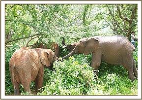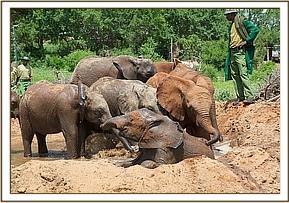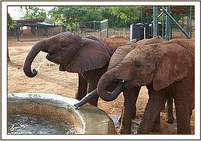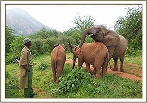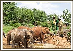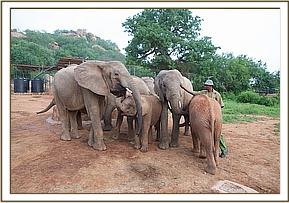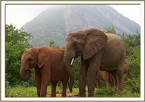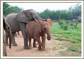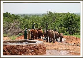 The convoy finally arrived at Ithumba at 11.00 am just as it was beginning to get very warm and humid and the babies were immediately off loaded. They were greeted by a profusion of every hue of green thanks to the recent rain. Despite it being an extremely hot and humid day the new lorry design worked very well, and none of the orphans lost much condition throughout the journey. As soon as they were off- loaded they immediately gulped down their milk feed and headed straight to the water trough where all the Keeper dependent Ithumba orphans, with Makena now their matriarch, waited eagerly for the new arrivals. They were greeted by warm rumblings, and tender touching trunks. Kilaguni, Chaimu and Sabachi remembered their orphan friends, and vice versa. Suguta, Tumaren, and Melia were initially a little withdrawn, with Suguta particularly clingy to her Keepers.