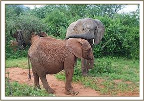Wendi’s herd accompanied the newcomers into the bush, and showered them with much love and attention. They were constantly surrounded and gently hugged and touched and fussed over. Watching their change of roles was fascinating as they went from being the little Matriarchs of the Nursery, to now suddenly reverting back to being babies again, with calf-mother behaviour such as feeding out of the older orphans mouths, and basking in all the attention. Wendi stayed close to Suguta, obviously sensing she needed the most guidance and comfort. Galana and Naserian showed a keen interest in Melia and Tumaren but both Tumaren and Melia were orphaned older, and clearly they still had good memories of their wild life before being orphaned and were adapting into their new life fast. For Melia she was in fact returning home, as she was rescued from Tsavo East National Park.