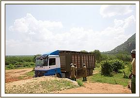 Early that morning all the Nursery orphans sensed something dramatic was happening, and seemed very unsettled, communicating extensively between each other, with Mutara particularly upset. She proceeded to break down her partition and attempted to clamber over her stable door, before a Keeper could return to her side and calm her down. Despite the unsettled atmosphere it did not seem to affect Melia and Suguta who both walked into their cubicles trustingly without any problems. Tumaren on the other hand, despite being the easiest throughout the practice sessions, had to have a shove from the Keepers before the truck doors could be closed. Overall the new system of loading the elephants simultaneously into one lorry, separated yet close and able to see each other, seemed to work well. The loading process was both smooth and quick and the convoy of two vehicles and the lorry set off on schedule at 4:30am headed for Ithumba, with Robert Carr-Hartley, leading proceedings.