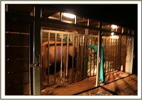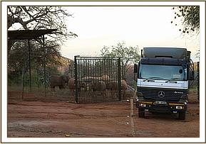 Under a dark sky veiled with thick rain clouds, the Keepers all got to work preparing for Tanos journey. Whilst the truck was put in position and the travelling compartments were opened and milk was prepared, a small injection of Stresnil was given to Tano keep her calm throughout the process. To help persuade Tano into the truck several other of her closest friends including Kanjoro, Mutara and Shukuru were also taken out of their stockade and led towards the truck. Tano was quick to follow her big bottle of milk but soon became aware of the truck and began to back off. Shukuru on the other hand was more interested in the milk and bundled everyone forwards, forcing Tano to also get a little closer. Nearly standing on the trucks ramp Tano began to get more anxious and refused to get any closer, with memories of the previous trip still clear in her mind, so the decision was to use straps to slowly ease her into the compartment whilst being encouraged with her milk. All of the Keepers lent a hand in coaxing Tano into the Truck, knowing that it was the best thing for her.