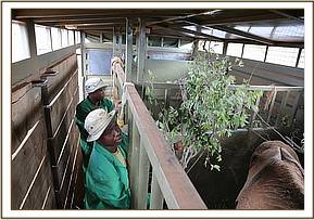 Orwa and Naipoki were first to greet Tano as she finished her milk and stared bewilderedly around the stockades she once called home. Once she balanced herself she immediately took off, knowing her surroundings intimately, heading through the compound and out towards the Parks forest eagerly followed by Orwa and the rest of the older orphans. Once in the familiar setting of the forest she began browsing on the lush vegetation available, whilst the other orphans smelled and touched her, following her everywhere. Having been in Ithumba for a few weeks Tano had already changed colour and was dramatically grey against the earthy red colour of the Nairobi orphans, standing out as having been in the wild and having many stories to tell her younger family in the coming days. As well as having a more temperate climate, the Nairobi stockades are better equipped to offer Tano the medical attention and care she needs. With the DSWTs new veterinary equipment, the Trust is now also capable of regularly checking Tanos health whilst investigating the cause of her medical issues.