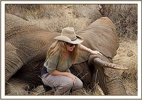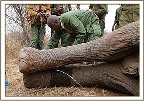 The elephant was darted from the chopper once on flat ground and the teams immediately moved in on foot the moment the bull fell down. Water was poured onto his ears in order to keep him cool and a stick was placed in his trunk to ensure he could breathe unhindered throughout the treatment.