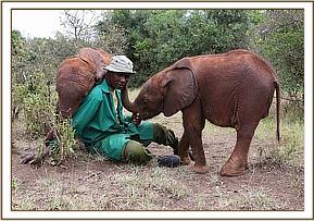 Her friend Ashaka arrived a pocketed size baby, rescued from a drying mudwallow in Tsavo. We ran the risk of lung infection in the early days but happily she is growing apace and putting on condition. Ashaka is extremely attached to her Keepers and nothing makes her happier than nestling close to them and thumb sucking. She loves the company of the other babies, and indeed the comfort of the older orphans, but the Keepers are the most important in her young life at the moment.
