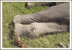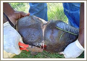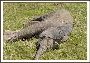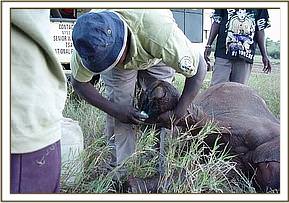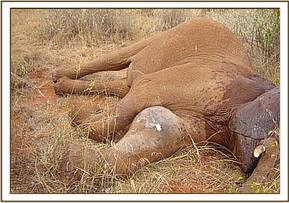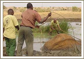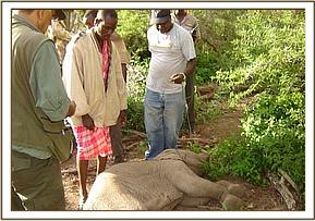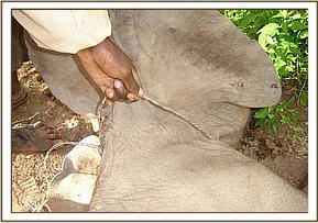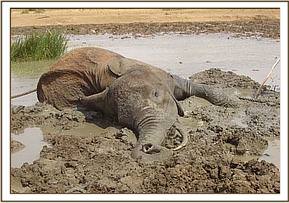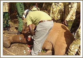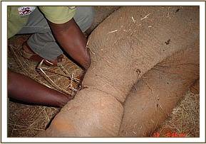 July 2005:- We were able to save a 12 year old female who had become stuck in mud at the Satao waterhole. Having pulled her free, she was given a long acting antibiotic injection as a precaution against pneumonia.