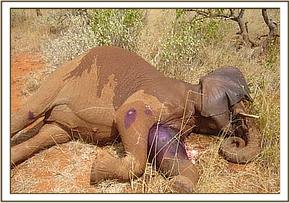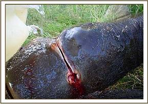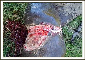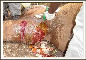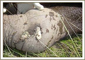 September 2004:- A three year old calf was found with a snare which had cut through the skin on the right fore leg. After the calf was immobilised, two cows (the mother and possibly the herd matriarch) refused to leave.