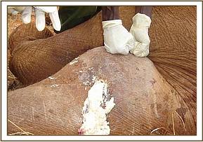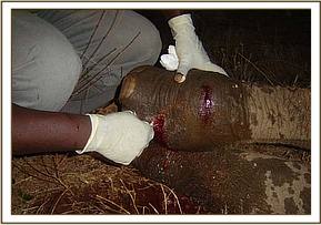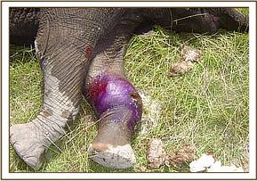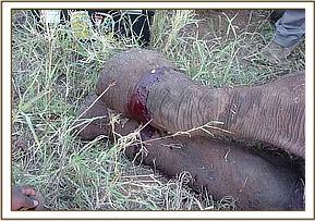 February 2004:- A 2 year old calf in Amboseli, snared around the foot by a steel cable, which had cut deep into the leg. This would undoubtedly have eventually immobilized the calf completely, and possibly causing the foot to fall away. Under anaesthesia the cable snare was able to be removed, though not without difficulty, the wound cleaned out, and a long acting antibiotic administered. This calf recovered, and re-joined its elephant family.