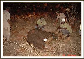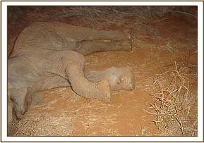 April 2005:- This particularly case, involving a snared 2 month old baby, was particularly complicated, since both the mother and the entire elephant family were extremely protective of the injured baby. First, the mother was immobilized, but the family then went off with the injured calf, so our Vet had to trail the herd until he could get clear sight of it in amongst the adults in order to get an immobilizing dart into it. Having finally achieved this, and before the calf went down, he had to rush back and revive the immobilized mother. He then went in search of the calf, knowing that by now the immobilizing drug would have taken affect. By the time they found the sleeping calf, darkness had set in, and the family had abandoned it, probably believing it dead. He was able to remove the snare, but since the family was nowhere near, the calf had to be held captive for the night, fed only water.