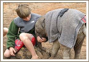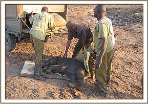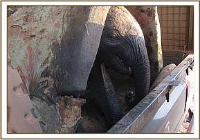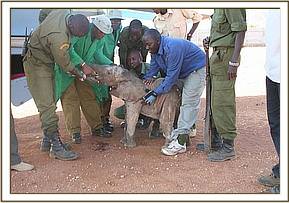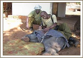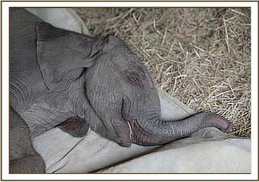 The David Sheldrick Wildlife Trust and KWS mobile veterinary unit were alerted by the camp about this young abandoned baby, and she spent the night of the 15th at the Voi stockades before being flown up to Nairobi on the 16th. She was a large calf and the umbilicus was detached, so we and the Keepers estimated her age to be about 2 weeks. As such, we assumed that she would have had her mother’s first colostrums milk which imparts the antibodies for survival. However, it was not until we read the Satao Camp Blog on the Internet that we discovered that she was, in fact, only born during the night of the 14th, the day before being rescued. Such newborn orphans need to receive an infusion of plasma as a replacement for the first colostrum milk to trigger the immune system, and this should be done as soon as possible. However, in the case of little Kigelia, this plasma life-saver came too late, since a number of days had already passed before we realized her circumstances. Despite receiving an infusion of elephant plasma the moment we discovered that she was infact a newborn, and despite trying desperately to keep her hydrated with drips, we simply could not stem the diarrheoa. She struggled bravely for 48 hours, but it was against the odds, and she passed away during the early hours of the 20th September, 2009. We were devastated, particularly as this was a tragedy that could possibly have been averted, had we known the circumstances better.