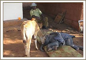 WAMBA: This miniature calf who was small for his age, was rescued by tribesmen near Wamba Northern Kenya on the 6th September 2009. Because the hind-side of his ears were dark, the umbilicus dry and detached and the soles of the feet showing signs of wear, we estimated his age to be about 2 – 3 weeks. Despite antibiotics and an infusion of intravenous blood plasma administered as soon as the Keepers reported that he was becoming “dull”, and the stools began turning into diarrheoa, he died suddenly during the night of the 17th September, 2009, none of the treatment having any affect on his worsening condition.