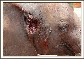 It was not quite time for the young gerenuk to take his first flight, when Angela Sheldrick called me with the alarming news that one of the orphan elephants, Shimba, had been mauled by a lion during the night, and had just been located by Julius and the other Voi elephant Keepers. Apparently the day before some of the orphans had been mingling with some wild elephants close to a waterhole filled from recent rains when yet another storm rolled in. The storm, and the accompanying thunder, had caused five orphans to run off into the rain with a wild herd. By nightfall they had not been found and the keepers had to leave them out for the night. On return first thing in the morning as they searched for the missing orphans (Kenia, Ndii, Emsaya, Layoni and Shimba) they came across Shimba, standing alone in a daze amidst what had been a violent battle. Bushes were trampled, blood covered the ground, and lion hair was strewn around. Shimba had received a serious mauling from a lion attack, but had obviously fought back and survived with some quite serious injuries. His right ear lobe had been torn out, and his trunk cut as if by a surgeons scalpel. Multiple slashes covered his back legs and back.