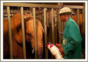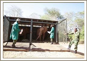 During the lead up to Sonje and Murera’s move, and despite endless practices with the Keepers and plenty of milk, Sonje adamantly refused to get into the elephant-mover truck unlike Murera who was far more comfortable following her Keepers inside. So when the final day arrived and it was time for these two orphans to make the four and a half hour journey from Nairobi to the Kibwezi Forest, KWS veterinarian Dominic Mijele was arranged to be present to assist with loading Sonje into the truck under tranquilisation which took place at 4.00am. Murera was loaded first without any resistance, whilst Sonje was briefly put to sleep and gently pulled onto the truck on a canvas stretcher before being quickly revived once inside.