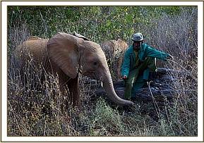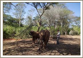 The journey went smoothly and thanks to the early hour of departure the orphans arrived in good time. It was just 8.30 am by the time the convoy turned into the Kibwezi Forest main gate and followed a track through the forest for 15kms before finally arriving at the very attractive new relocation unit surrounded by shady acacia and yellow fever trees. This unit has been carefully designed by Angela Sheldrick and sensitively constructed to offer practical refuge for the orphans at night, whilst ensuring minimal disturbance to the habitat. Philip Okonde has been chosen to be Head Keeper of this new unit, and to take on the role that Edwin, Benjamin and Joseph so ably hold for the other DSWT Orphan Units. Joining Philip to begin with are Amos, Simon and Aden, which makes a very experienced Keeper team.