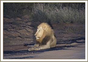 Taru, Angela’s 13 year old son, played a recording of hyenas and jackals on a kill from his Ipod at the front door of his home, and two magnificent male lions, resplendent with full black manes approached with interest, causing Taru to rapidly close the door and retreat into the house. We all then decided to drive in the Landrover to take a closer look meeting one lion on the road behind the elephant stockades, taking a look at the elephant occupants who were already in for the night. We followed him as he walked along the road, his companion keeping pace in the bush at the right, until he decided to lie down and take a rest in the middle of the road just beyond the Visitors’ Carpark. So accustomed to the presence of a vehicle was he that he didn’t bat an eyelid, and allowed us to get right beside him, as a full moon rose in the East – surely an auspicious beginning on a magical night to herald the onset of year 2012.