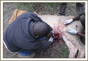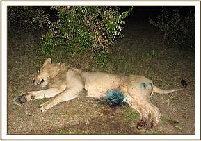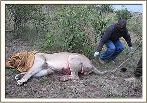 The surgery took slightly over an hour and by the time we were through it was already getting dark. The other pride members did not in any way try to attack us despite our proximity to them. We were actually working next to their kill and 10 meters from where the other pride members were having an afternoon nap! We concluded that the other members clearly understood and appreciated that we were only out helping their kin who was wounded and in pain.