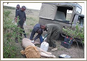 The Kenya Wildlife Service Veterinary Department quickly provided a Veterinarian who was immediately booked by the David Sheldrick Wildlife Trust on the next available flight to the Mara. The Vet arrived at four in the afternoon, and immediately went down to business. The lion was successfully darted and went recumbent twenty minutes later.