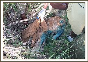 There were Four Lionesses, a Lion and the cubs in the pride. Three of the cubs aged approximately three months looked scruffy and clearly had a problem with their skin. They needed our attention. But how would we capture the cubs without attracting the wrath of all these Lionesses who kept a sharp eye over their beautiful cubs? An option would have been to dart all of them and capture the cubs as they slept but that would be risking too many lives especially these tiny and defenseless souls. We therefore decided to try and herd the three cubs aside from the mothers and try to physically capture and treat them. We managed to push them twenty meters away with all the Lionesses keeping an eye on us and trying to understand what we wanted to do with their cubs. Once a safe distance away we jumped out of the car and started chasing after the cubs. They all hid in the long grass next to Mara River and fortunately we captured one by one administering all the necessary drugs and letting them go where their Mothers were all waiting. Our biggest surprise was that they never tried to attack us from the close distance and it was amazing and unbelievable to think that they could tell by their instincts that we were saving the lives of their cubs. In the late afternoon we came back and physically captured the fourth cub that was older at five months but weak and emaciated. He was in the company of his two other brothers who ran a few meters away and watched us keenly as we attended to their sick brother.