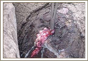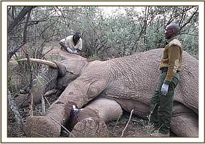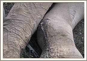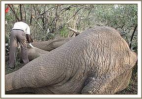 Towards the end of June, the Mara mobile Vet Unit was informed by The Narok District Game Warden of a bull elephant that was injured and required the attention of our unit. We set out for the drive from Masai Mara to the Ol Donyo Rasha Hills, some 50 Miles where he had been seen last.We arrived at the spot in the afternoon and started searching for this particular bull and fortunately late in the afternoon we were lucky to find him. He was walking with a heavy limp and closer examination revealed a very swollen front right foot with pus oozing from an injury on the joint just above the toes. The Vet successfully darted him and he went down fifteen minutes later. Further examination revealed a deep wound inflicted by a very sharp object which we suspected was poisoned thus causing severe gangrenous swelling of the whole foot of this bull.