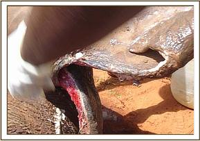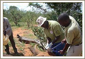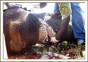 The David Sheldrick Wildlife Trust’s Mobile Veterinary Unit, funded by the Austrian NGO Vier Pfoten, has saved the lives of numerous animals in the three years it has been operational and the unit has been able to save the lives of over 100 elephants. Many of the wounds inflicted by wire snares, poisonous arrows, spear wounds, and bullet wounds. On the 22nd May Dr. David Ndeereh treated this particular bull with a snare around the head on the KMC ranch close to MacKinnon Road.