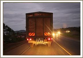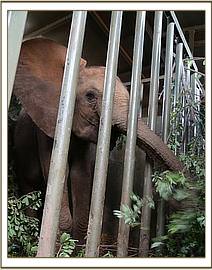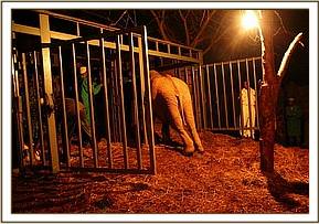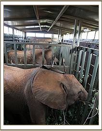 The move was again planned for the 4th of December when the three girls were woken at 3 a.m, given a tranquilizer injection to take the edge off the experience and loaded again, Rorogoi going into the truck first without a problem. However, when Arruba and Mashariki saw the night time scenario set up again, with masses of Keepers milling around, and lights strung in the trees, they instantly knew that something was up, and flatly refused to be loaded, even sitting on their haunches in defiance. A strap was placed around their forelegs and together with a bottle of milk for further temptation; they were muscled into the truck. Once within they appeared resigned, taking their milk bottles with great enthusiasm and remaining silent and calm, so this time the “elephant convoy” left at around 4.30 a.m. having been slightly delayed.