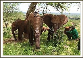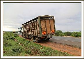 The Elephant Moving Truck negotiated the usually congested Nairobi roads with ease due to the early hour, and thankfully on this morning the heavy rain stayed away replaced by just a light drizzle and low mist which kept conditions cool. However, as the journey proceeded, the temperatures rose but thankfully the ventilation in the customized vehicle proved adequate and the built- in water tank ensured that the orphans could be cooled down if need be. Despite all the extra morning milk bottles, Mashariki was loudly demanding greens, so the truck stopped twice en route to cut extra branches for the hungry orphans who spent the rest of their journey feeding, with the exception of Rorogoi who remained quiet throughout the journey succumbing to the effects of the Stressnil. Arruba somehow managed to lift her gate forcing the truck to stop for a third time in order to replace it back securely on its hinges.