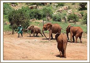 The orphans slept well throughout the night and didn’t call out in their new, shared, surroundings. Lesanju’s herd remained within their Open Stockade, obviously wanting to stay close to monitor their young charges. At dawn the newcomers were waiting patiently for their milk at the Stockade Gate and already knew where to go the moment the door was opened. There they were quickly joined by the slightly larger orphans and then the oldest ones. When Lesanju’s herd came down to the water hole, the younger orphans moved aside after which Arruba, Mashariki and Rorogoi led the way into the nearby bush and immediately started browsing near Sinya, joined by the other orphans, none of whom were in a rush to go anywhere. As the herd ascended the slopes of Mzima Hill, the newcomers appeared quite at home, easily negotiating the unfamiliar rocky terrain and enjoying the new sights, smells and food that encompassed them. We look forward to following their progress and watching these Mini Nursery Matriarchs assimilate into the orphan herd, now being the babies of the group. This will be a significant change for them, especially for young Arruba, but we know they will embrace their journey back into the wild, a journey that will take many years under our watchful eye. The first steps of that journey have been accomplished successfully and the newcomers seem genuinely happy in their new home, surrounded by a very loving adopted elephant family, and like many of our Ex Orphans, no doubt will one day know the joy of a family of their very own with the birth of wild- born babies.