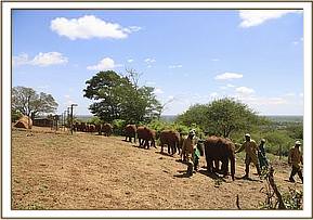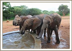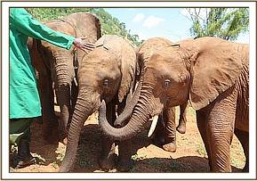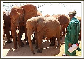 At 5pm, when it was time to return to the stockades, Arruba, Rorogoi and Mashariki were led back first for their milk and having gulped down their bottles, they returned to the waterhole to again cool themselves and by the time the others came in, the new arrivals were clearly distinguishable being the wettest orphans in the herd. Rorogoi, overcame her shyness, and was soon back to her old tricks; reaching through the wire fence to try and sneak an extra milk bottle and even trying to push Panda away in order to try and usurp her share.
