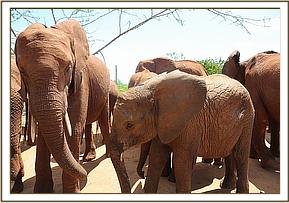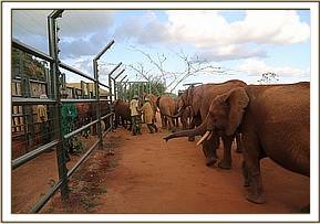 The Truck finally climbed the incline leading to the Voi stockades at 11 a.m. and all the Voi dependent orphans were there waiting, fully aware that an ‘event’ was unfolding on this day. Lesanju and Wasessa were the first to approach the fence separating the mud wallow from the loading bay, raising their trunks in anticipation, as they knew that more babies were arriving into their fold. Their excitement was clearly evident.