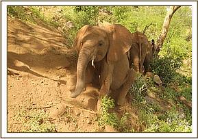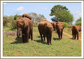 The Keepers allowed the elephants to intermingle for a while before calling the new arrivals towards the water hole. Arruba and Mashariki were clearly feeling the heat, since Tsavo is significantly hotter than Nairobi temperatures. Enthusiastically they cooled themselves with water, Mashariki actually climbing into the waterhole and Lesanju following to ensure that she had company. In his excitement Taveta attempted to mount Arruba, but the Keepers intervened to thwart his attempt. Meanwhile Rorogoi was eclipsed in the midst of all the other orphans both big and small and it wasn’t long before they were all in the mudbath making it difficult to differentiate the new arrivals from the residents. After a while the Keepers summonsed their charges and Arruba and Mashariki responded, the others following closely behind. Arruba and Mashariki then led the orphans into the bush for the first time, leaving Rorogoi behind, but she soon realized that her Nursery friends had gone and was quick to catch up. Once out in the bush, Tundani, Lentili and Nelion spent time communicating with them, while Sinya undertook baby- sitting duties.
