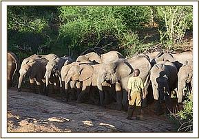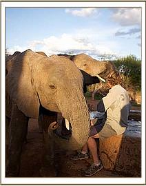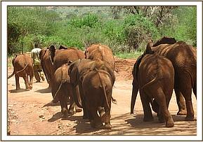 Having taken their milk, and enjoyed a cooling mudbath, Loijuk led the newcomers off into the bush beyond the Stockade compound, where another exceedingly exuberant and surprising greeting awaited them. Yatta, Wendi and the Senior ex orphans suddenly appeared as though by magic, obviously sensing that an unusual event had taken place back at base. Enesoit, Meibai and Naimina were soon in the midst of a huge herd of older elephants, all tenderly extending trunks to touch and greet them amidst trumpeting, bellowing and urinating. It must have been like a dream come true for three youngsters who not long ago had faced death, Meibai having arrived in the Nursery already comatose!