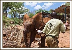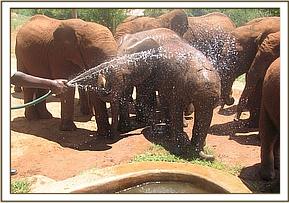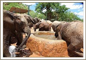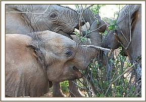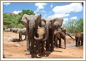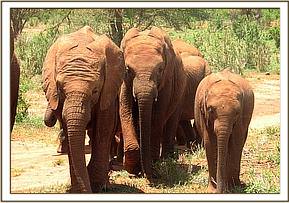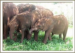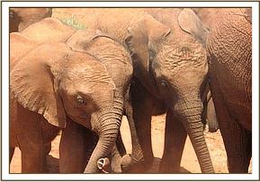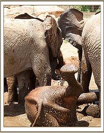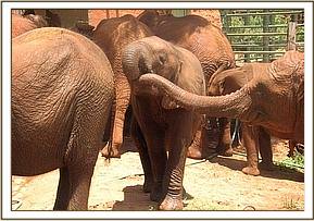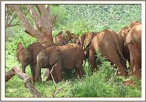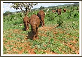 By 7 a.m. the convoy carrying the elephants,(led by Robert Carr-Hartley and his father, Roy in a Landrover) were well past Salama on the main Nairobi – Mombasa highway, heading towards Kibwezi, where Lionel Nutter, our Tsavo Field Manager would be waiting to escort Kenia and Shira to the Voi Stockades. There Robert and the trucks carrying Meibai, Enesoit and Naimina would peel off the tarred Mombasa road to follow the rough dirt track to Ithumba. Theirs would be a more tiring, hot and longer more grueling journey than that of Kenia and Shira, who were at the Voi Stockades by 11 a.m., there welcomed warmly by Tassia and Taveta, who remembered them instantly. It took a little while for Lesanju, Lempaute, Wasessa and Sinya to recognize Kenia, who was no longer the small baby they remembered in the Nursery, usually separated from them to keep order amongst those even smaller! But they, too, soon began to take a keen interest in the newcomers, who meanwhile had settled in like veterans, and were soon enjoying a milk feed plus a cooling dousing of water over their heated bodies, followed by a glorious mudbath and a red dustbath that turned them the colour of Tsavo and the others. Acres of fresh new grass must have appeared as though manna from Heaven for the Nairobi newcomers, since there has been practically no substantial rain back at the Nursery for over a year. Escorted by the established elephants, Kenia and Shira were soon tucking into all this, and appeared small beside the others. As such they can be assured of endless pampering from the older females, and the companionship of the three little boys, Taveta, Tassia and laid back Shimba who simply took everything in his stride as though it was normal!