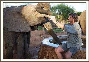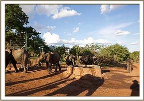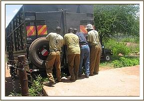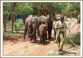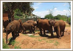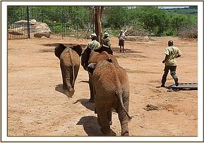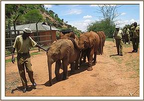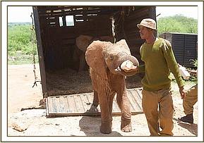 Except for one slight hitch, when the truck carrying Kenia and Shira failed to start do to the battery being flat, and had to have a tow-start, all three trucks were pulling out of the yard by 4.30 a.m., waved on their way by all the Nursery Staff who lined up to see the elephants off and wish them well. They would be missed of course by all, but especially by their little elephant friends, especially Dida, who has always been very close to Kenia, and upon whose shoulders leadership of the Nursery orphans would now rest.