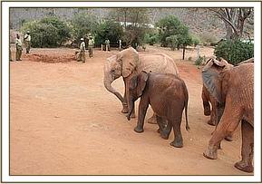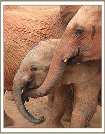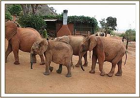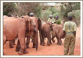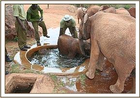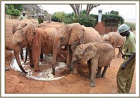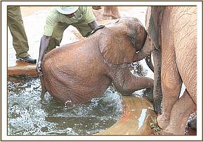 Before 12 noon they were at Voi, with the stockade mudbath prepared for their arrival and their old nursery orphan friends waiting close at hand. They were greeted by the older Voi orphans amid rapturous trumpets and much excitement, and Tassia was immediately singled out as Lempaute’s favorite calf. Lesanju and Lempaute seemed especially delighted to have two little ones to tend to and ensured their first steps in Tsavo East were shadowed by protective ‘Old Hands’. The new babies seemed totally at home in their new environment the moment they arrived, with Taveta even jumping into the water trough completely submerging himself.